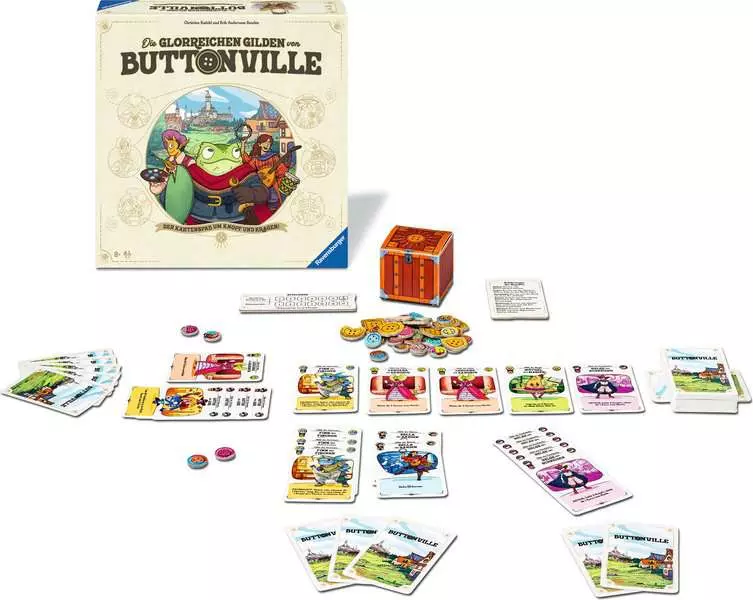 Die Glorreichen Gilden von Buttonville ist ein Kartenspiel für 2 bis 4 Spieler ab 8 Jahren. Rekrutiere so viele Dorfbewohner wie möglich und nutze deren Fähigkeiten. In deinem Zug rekrutierst du 2 Dorfbewohner vom Markt oder vom Nachziehstapel und dann kannst du mehrere Karten desselben Dorfbewohners spielen, die ein Set bilden. Die meisten Dorfbewohner haben unglaubliche Fähigkeiten. Manchmal wird die Wirkung stärker, je mehr identische Dorfbewohner du im Set spielst. Am Ende bringt dir jedes Set Dorfbewohner-Siegespunkte, basierend auf der Anzahl der Dorfbewohner in jedem deiner Sets. Spiele deine Karten geschickt, um das Spiel zu gewinnen!