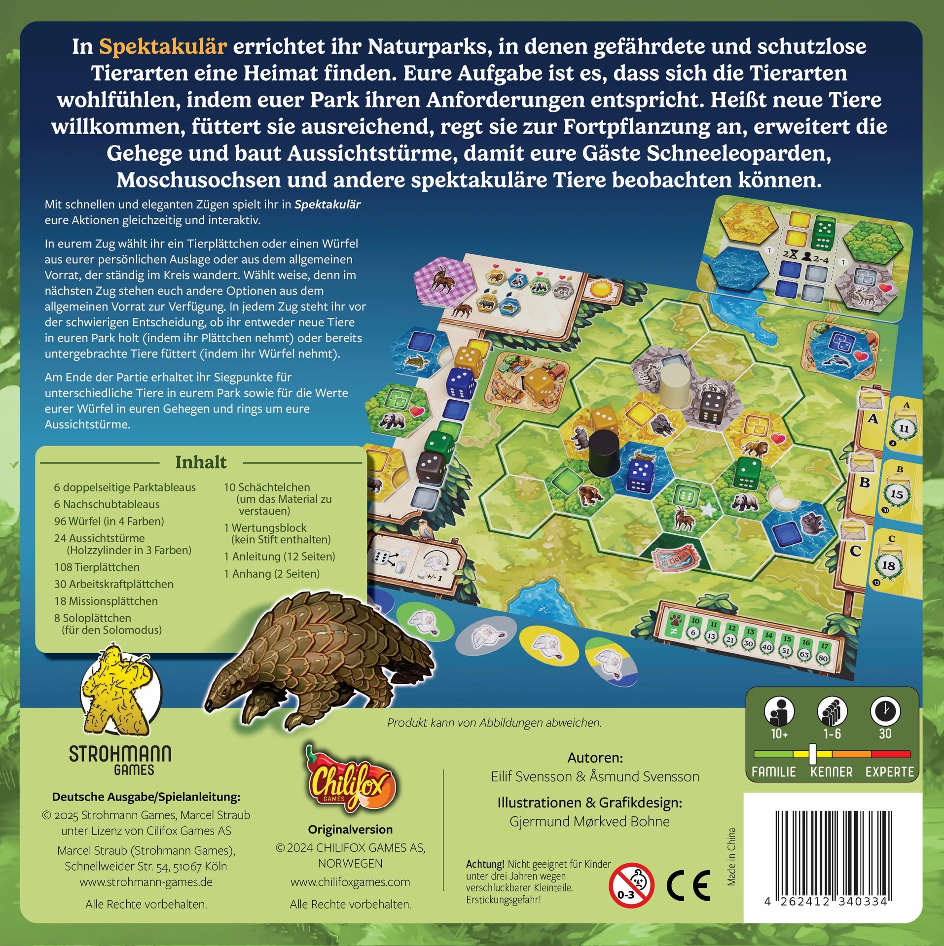 Spektakulär ist ein Drafting- und Plättchenlegespiel, in dem ihr eure Aktionen gleichzeitig ausführt. In eurem Zug wählt ihr ein Tierplättchen oder einen Würfel aus eurer persönlichen Auslage oder aus dem sich im Kreis bewegenden allgemeinen Vorrat. Wählt weise, denn im nächsten Zug stehen euch andere Optionen zur Verfügung! Ihr steht in jedem Zug erneut vor der schwierigen Entscheidung, ob ihr entweder neue Tiere in euren Park holt (indem ihr Plättchen nehmt) oder bereits untergebrachte Tiere füttert (indem ihr Würfel nehmt).